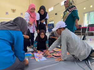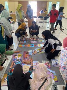 Peserta melakukan praktik menggunakan media komunikasi lokal untuk menyampaikan pesan kesehatan secara efektif melalui permainan, diskusi kelompok, dan kartu visual edukasi. -
